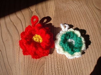 赤のほうが大きく仕上がってるのは毛糸の太さの違い。