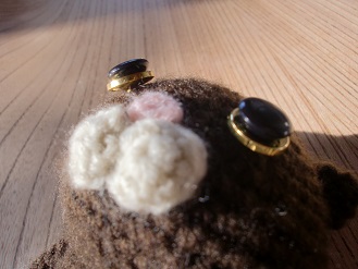 手持ちのボタンの中にあみぐるみの目がなかったので、平たい金ボタンと黒い目玉ボタンで代用しました。